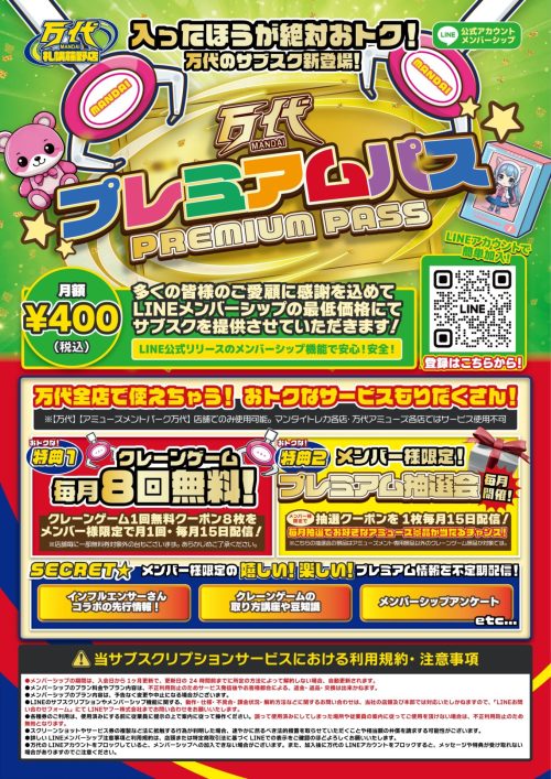 【万代のサブスク遂に始動】 皆様からのご要望にお応えし、万代公式メンバーシップを開設! 日頃ご利用いただいている皆様が 更にお安くプレイできるメンバーシップ! 〇毎月15日は特典クーポン配信日〇 【クレーンゲーム無料券8回分】 【限定プレミアム抽選会の抽選券】 クーポンはご登録初回並びに翌月以降も毎月1度15日に配信 クーポンの使用期間は15日~翌月14日まで 更に!メンバー限定お得情報も不定期配信予定! インフルエンサーコラボ先行情報 クレーンゲーム取り方講座や豆知識 メンバーシップアンケート などなど メンバーシップに加入して毎月メンバー限定のお得な特典をGET! 是非お安くプレイ出来るこのチャンスをお見逃しなく! 詳細は下記URLかプロフィールから ↓ ↓ ↓ ↓ ↓ ↓ ↓ ↓ ↓ ↓