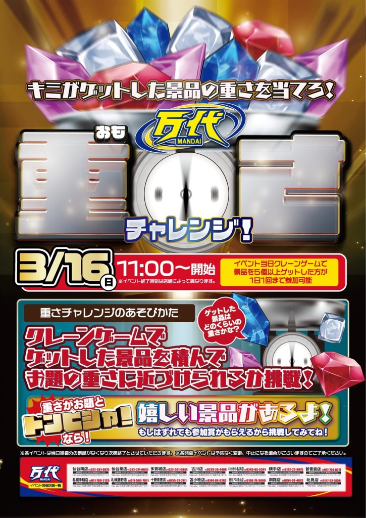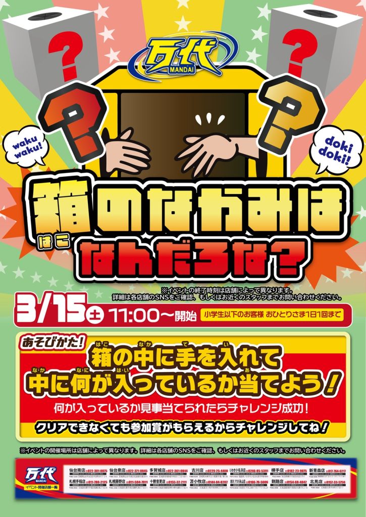 今月は 3/1~3/31 まで連日開催 【キーワードを探せイベント】 ヒントをたどって、箱の中の文字を埋めよう!! ↓ 【今週末のイベントはこちら】 ↓![]()