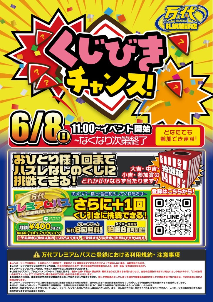 皆様からのご要望にお応えし、万代公式メンバーシップを開設! 日頃ご利用いただいている皆様が 更にお安くプレイできるメンバーシップ! 〇毎月15日は特典クーポン配信日〇 【クレーンゲーム無料券8回分】 【限定プレミアム抽選会の抽選券】 クーポンはご登録初回並びに翌月以降も毎月1度15日に配信 クーポンの使用期間は15日~翌月14日まで 更に!メンバー限定お得情報も不定期配信予定! インフルエンサーコラボ先行情報 クレーンゲーム取り方講座や豆知識 メンバーシップアンケート などなど メンバーシップに加入して毎月メンバー限定のお得な特典をGET! 是非お安くプレイ出来るこのチャンスをお見逃しなく! 詳細は下記URLから ↓ ↓ ↓ ↓ ↓ ↓ ↓ ↓ ↓ ↓ https://lin.ee/DM06POkd