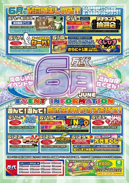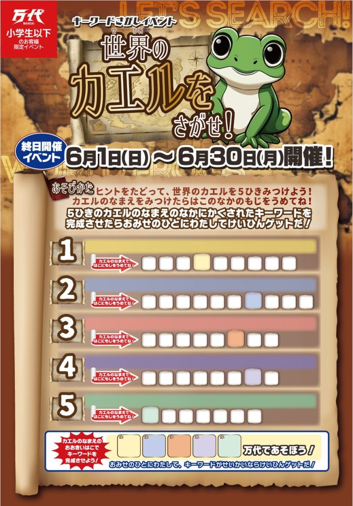 6/1~6/30 まで連日開催 【世界のカエルを探せ!】 カエルの名前にかくされたキーワードを探して景品ゲット!! ↓ 【今週のイベントはこちら】 ↓