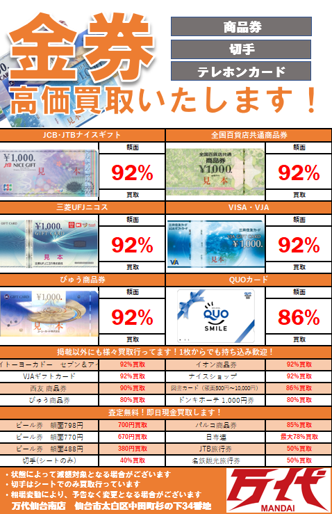 【JCB】【百貨店共通】【三菱UFJニコス】【VISA・VJA】【びゅう商品券】【QUOカード】