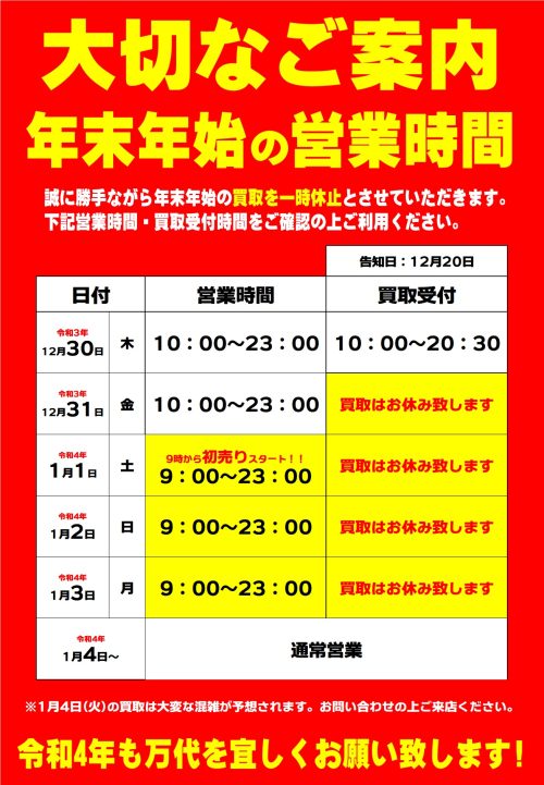 誠に勝手ながら年末年始の買取を一時休止とさせていただきます。